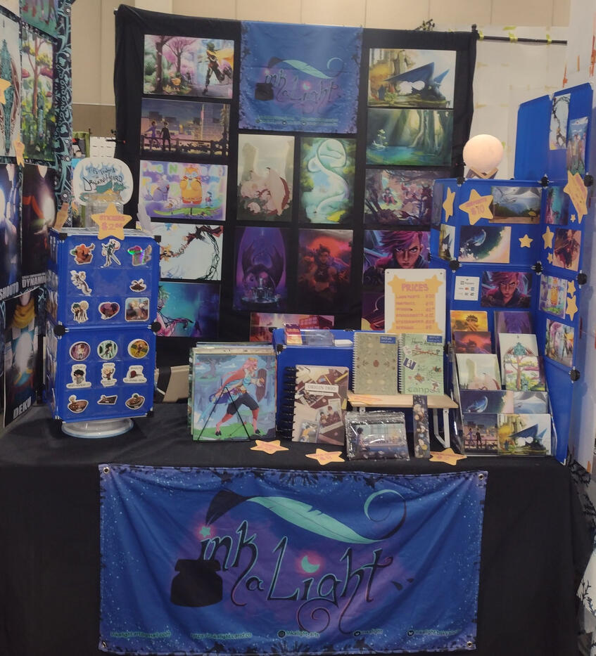Since 2021, the Inkalight company has been selling at Conventions. We create with a love for making works inspired by stories, dreaming big, and chasing after creativity. Our booth has evolved through time with Inky's efforts to bring new illustrations as prints for those who share that love for inspiring stories and each other.In 2026, Inkalight will be vending at: iMagicon, Isekai Anime Con, Black Hills Con, and more. There will be new prints and merch designs prepared for all who support us at these conventions.Hope to see you there!